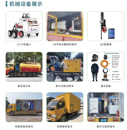 公司投入巨资引进国际先进设备,涵盖紫外光固化修复车、热塑成型修复车、碎裂管修复车、高压吸污车等全系列专业装备,搭配自主研发的核心专利技术,构建起 “智能检测 - 精准修复 - 全程监控” 的现代化施工体系,施工效率与修复质量行业领先。